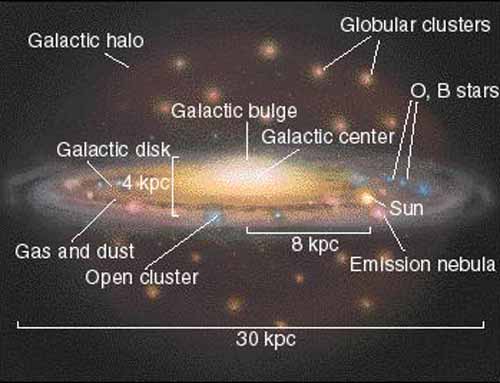 The galactic disc, which bulges outward at the galactic center, has a diameter of between 70,000 and 100,000 light-years. The distance from the Sun to the galactic center is now estimated at 26,000 - 1400 light-years, while older estimates could put the Sun as far as 35,000 light-years from the central bulge.