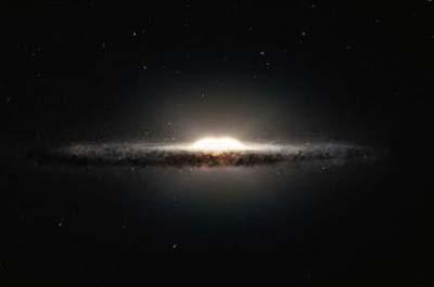 This artist's impression shows how the Milky Way galaxy would look seen from almost edge on and from a very different perspective than we get from the Earth. The central bulge shows up as a peanut shaped glowing ball of stars and the spiral arms and their associated dust clouds form a narrow band. Two groups of astronomers have used data from ESO telescopes to make the best three-dimensional map yet of the central parts of the Milky Way. They have found that the inner regions take on a peanut-like, or X-shaped, appearance from some angles. This odd shape was mapped by using public data from ESO's VISTA survey telescope along with measurements of the motions of hundreds of very faint stars in the central bulge.
