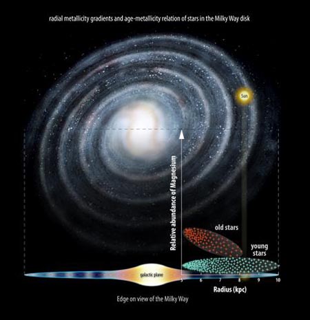 team of scientists headed by Ivan Minchev from the Leibniz Institute for Astrophysics Potsdam (AIP), has found a way to reconstruct the evolutionary history of our galaxy, the Milky Way, to a new level of detail. The investigation of a data set of stars near the Sun was decisive for the now published results. The astronomers studied how the vertical motions of stars - in the direction perpendicular to the galactic disc - depend on their ages. Because a direct determination of the age of stars is difficult, the astronomers instead analyzed the chemical composition of stars: an increase in the ratio of magnesium to iron ([Mg/Fe]) points to a greater age.