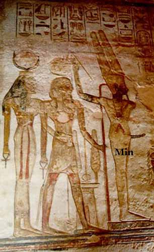 Although not mentioned by name a reference to 'he whose arm is raised in the East' in the Pyramid Texts is thought to refer to Min. His importance grew in the Middle Kingdom when he became even more closely linked with Horus as the deity Min-Horus. By the New Kingdom he was also fused with Amen in the deity Min-Amen-kamutef (Min-Amen - bull of his mother). Min's shrine was crowned with a pair of bull horns.
