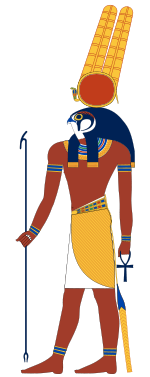 In Ancient Egyptian art, he was pictured as a falcon-headed or bull-headed man who wore the sun-disc, with two plumes on his head, the falcon representing the sky, and the bull representing strength and war. He would hold various weaponry, including scimitars, bows and arrows, and knives in his hands.