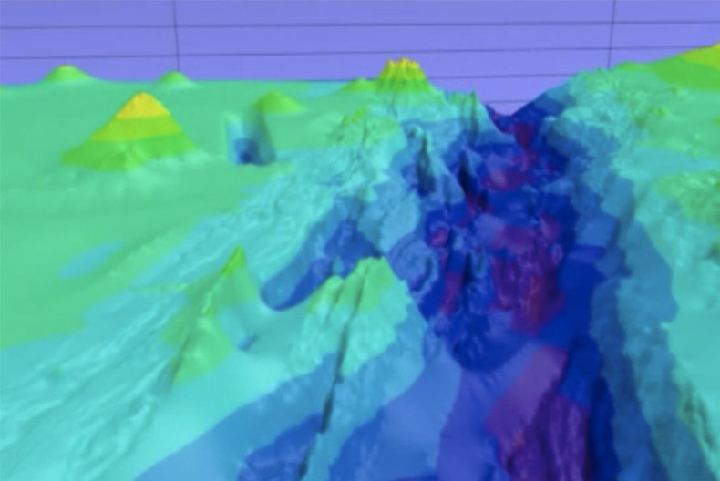 Startling new images from the depths of the Pacific Ocean reveal one of Earth's most violent processes: the destruction of massive underwater mountains. The pictures were created by sonar in waters up to 6km (4mi) deep. They expose how tectonic action is dragging giant volcanoes into a chasm in the seabed. The volcanoes are strung across several thousand kilometres of ocean floor and are moving westward on the Pacific tectonic plate at up to 6cm per year. The extraordinary scene was captured along the Tonga Trench during a research expedition last summer.