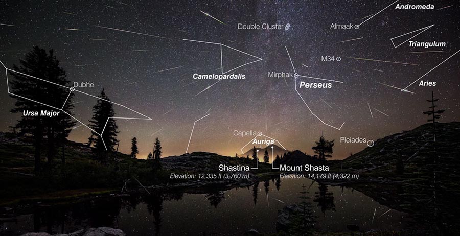 APOD - August 8, 2016Explanation: Where are all of these meteors coming from? In terms of direction on the sky, the pointed answer is the constellation of Perseus. That is why the meteor shower that peaks later this week is known as the Perseids -- the meteors all appear to came from a radiant toward Perseus. In terms of parent body, though, the sand-sized debris that makes up the Perseids meteors come from Comet Swift-Tuttle. The comet follows a well-defined orbit around our Sun, and the part of the orbit that approaches Earth is superposed in front of the Perseus. Therefore, when Earth crosses this orbit, the radiant point of falling debris appears in Perseus. Featured here, a composite image containing over 60 meteors from last August's Pereids meteor shower shows many bright meteors that streaked over Mount Shasta, California, USA. This year's Perseids holds promise to be the best meteor shower of the year.