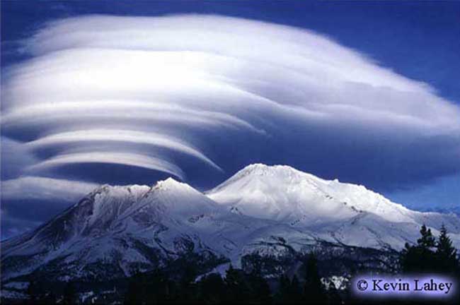 Lenticular clouds often form over Mount Shasta. This is a fairly typical meteorological phenomenon over high places on the Earth, which are often mistaken for UFOs.