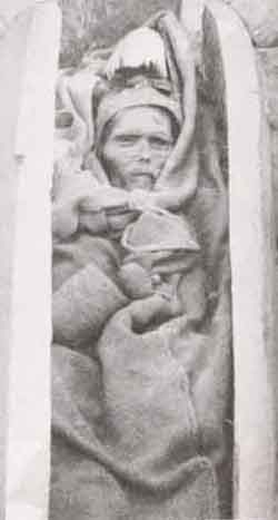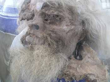 Notable mummies are the tall, red-haired "Charchan man" or the "Ur-David" (1000 BC); his son (1000 BC), a small 1-year-old baby with blond hair protruding from under a red and blue felt cap, and blue stones in place of the eyes; the "Hami Mummy" (c. 1400-800 BC), a "red-headed beauty" found in Qizilchoqa; and the "Witches of Subeshi" (4th or 3rd century BC), who wore tall pointed hats. Read More ...