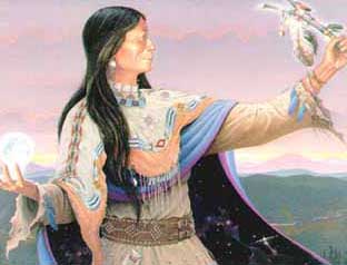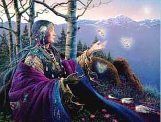 This is a wonderful, dramatic Eskimo myth, parts of which are widely known, spread from Siberia to Greenland. The myth speaks of society rather than the universe. Raven is a trickster god who travels from heaven to earth and sometimes, in some stories, to the seafloor. He has sacred power and can change form. Raven instructs people in living. He creates first-man through the pea vine and other people and animals from clay taken from the earth-creek. Eskimo Woman Prophecy