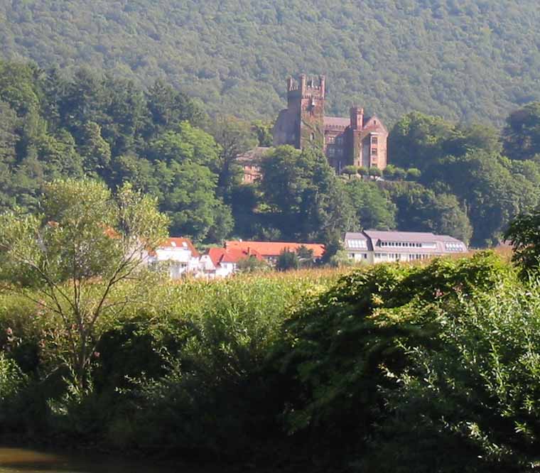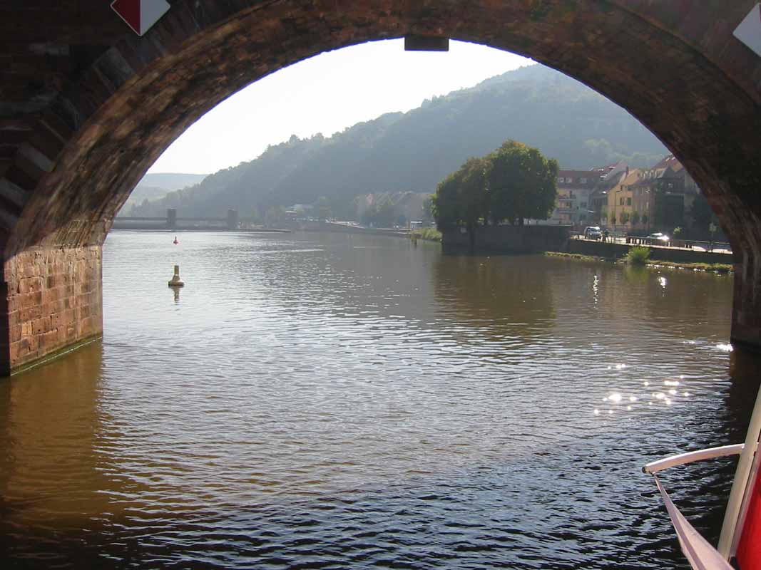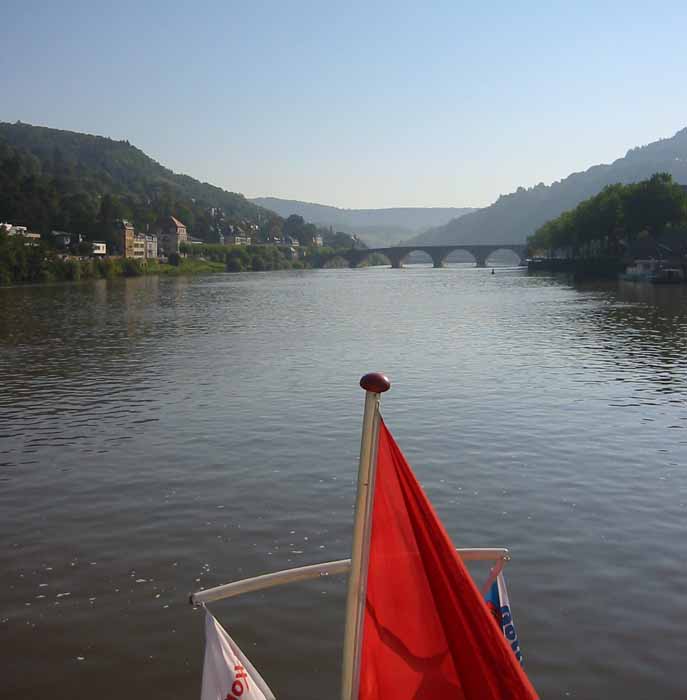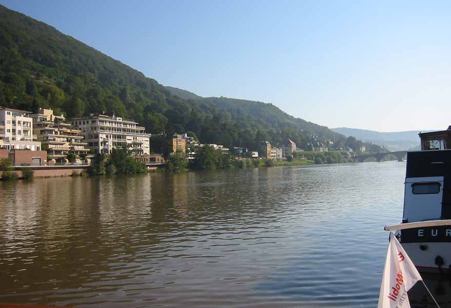 On the boat we sat outside, just below the captain, in the front, the bow on the journey upriver so we could take pictures and enjoy the countryside. On the way back to Heidelberg we sat inside at a table, where food or beverages were served, though we only drank bottled water.