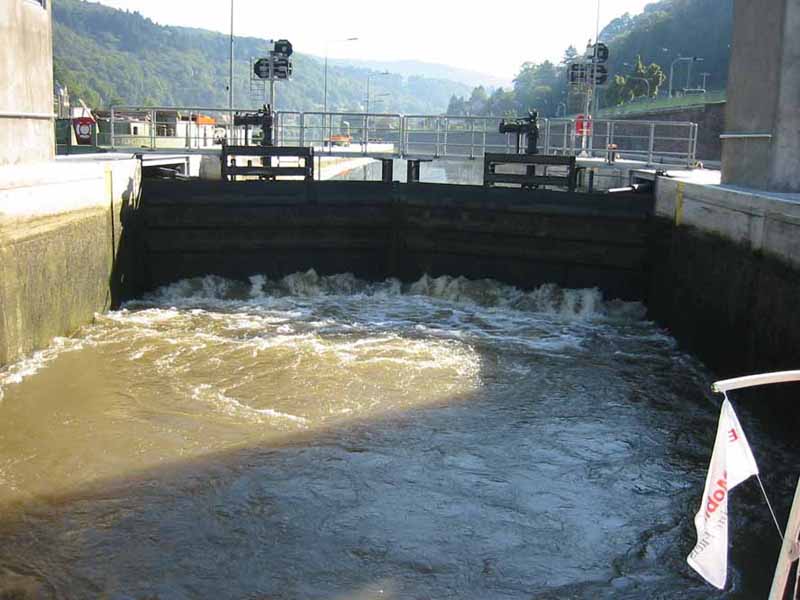To move into deeper water, you wait as they flood the levee and open the gates.