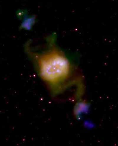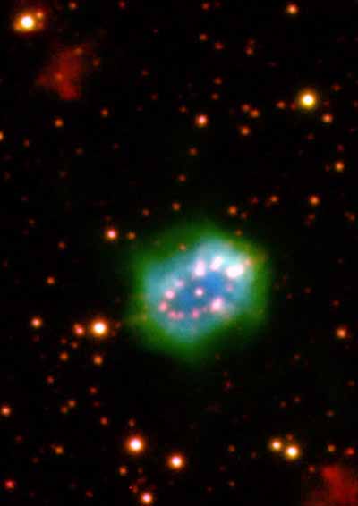 But the Necklace Nebula's central star, near the center of a ring strongly tilted to our line of sight, has also been shown to be binary, a close system of two stars with an orbital period of just over a day. Astronomers estimating the apparent age of the ring to be around 5,000 years, also find more distant gas clouds perpendicular to the ring plane, seen here at the upper left and lower right. Those clouds were likely ejected about 5,000 years before the clouds forming the necklace. This false color image combines emission from ionized hydrogen in blue, oxygen in green, and nitrogen in red.