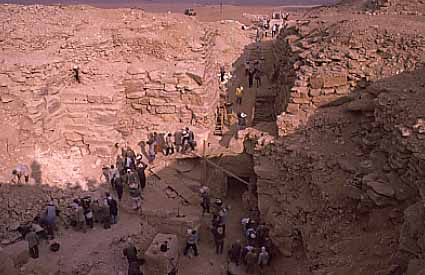 The core was built of horizontal layers about a meter high, with the outer mantle consisting of large, rough blocks up to five meters long. These were stacked to make the first core step about seven meters high.A clay mortar was used for binding. Internal blocks, particularly around the cavities, were smaller. In between the inner and outer layers of the core was fill, consisting of sand, rubble, clay and some stone fragments. We believe Neferefre probably died prior to completion of the first core level, so the remainder of the pyramid that was finished, as well as the mortuary temple were probably by his successors.