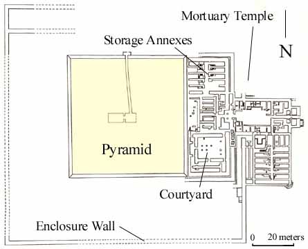 On the east side of the same foundation on which the pyramid is built a very small mortuary temple, aligned north-south, was also built of smaller blocks of fine white limestone. The entrance was by a stairway and ramp on the southeast. Just behind the entrance is a small basin that was used by the priests to perform ritual purification. Because of the ruined state of this temple, we can only guess at much of its design. As usual, there was an offering hall in the center of the temple. There is a depression its floor that was probably left by an alter but, for example, if there was a false door on the west wall as in other temples, no evidence of it can be found. We are also unsure exactly who built this oldest part of the temple.