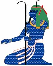 The god was shown as either a frog-headed man, or as a bearded blue or green man, similar in appearance to Hapi, but wearing the palm frond (symbolising long life) on his head, and holding another in his hand. He was also shown rising up out of a body of water, carrying the solar barque in his up stretched hands.