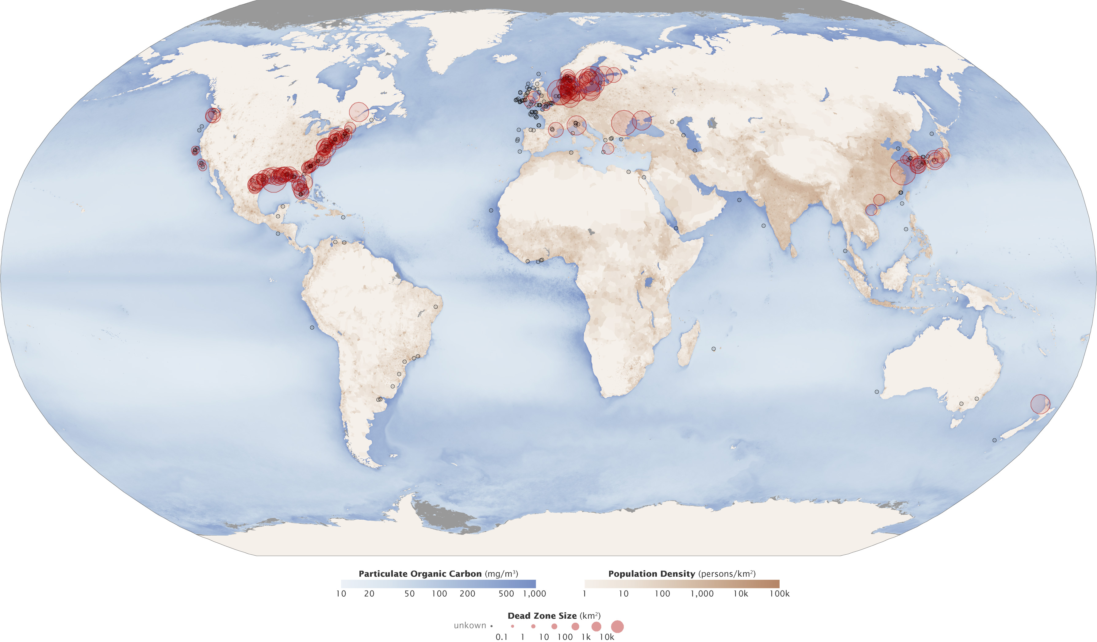 Other marine dead zones have apparently appeared in coastal waters of South America, China, Japan, and New Zealand. A 2008 study counted 405 dead zones worldwide.