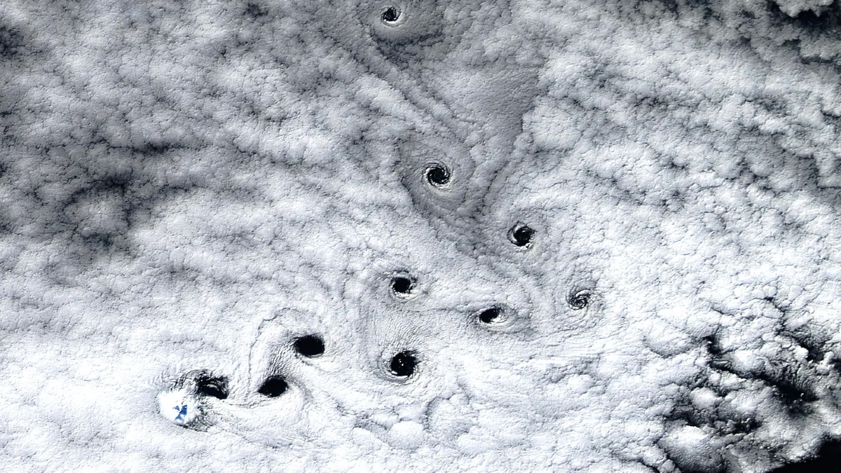 This striking satellite photo shows 10 swirling "dark voids" that appeared above an uninhabited volcanic island in the Indian Ocean. The black spots are the result of atmospheric cloud vortices, but are oddly pronounced and significantly contorted compared to most other examples of this phenomenon. On average, the dark spots are around 8 miles (13 km) wide, decreasing slightly in size the further they have traveled.