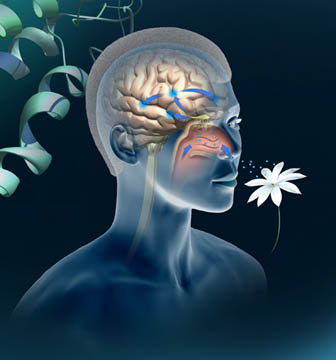 At the top of your nasal passages behind your nose, there is a patch of special neurons about the size of a postage stamp. These neurons are unique in that they are out in the open where they can come into contact with the air. They have hair-like projections called cilia that increase their surface area. An odor molecule binds to these cilia to trigger the neuron and cause you to perceive a smell.