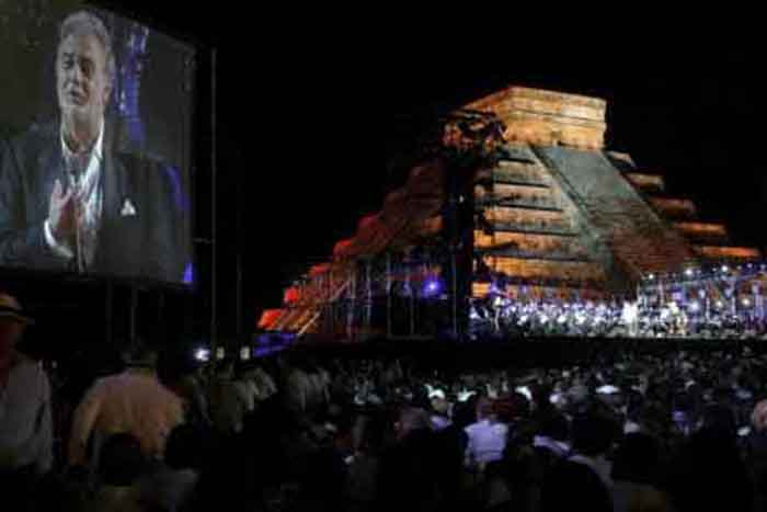 Tenor Placido Domingo's choice of a classical program, peppered with local music, and help from Mexican pianist and crooner Armando Manzanero, appeared to smooth the controversy surrounding his Saturday concert at the Mayan pyramids of Chichen Itza elected one of the New Seven Wonders of the World in a recent Internet poll.