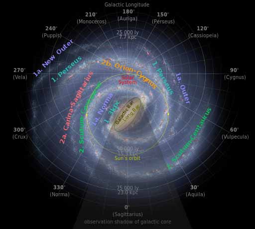 The Orion Arm is a minor spiral arm of the Milky Way Galaxy some 3,500 light-years (1,100 parsecs) across and approximately 10,000 light-years (3,100 parsecs) in length. The Solar System, including the Earth, lies within the Orion Arm. It is also referred to by its full name, the OrionÐCygnus Arm, as well as Local Arm, Orion Bridge, and formerly, the Local Spur and Orion Spur.