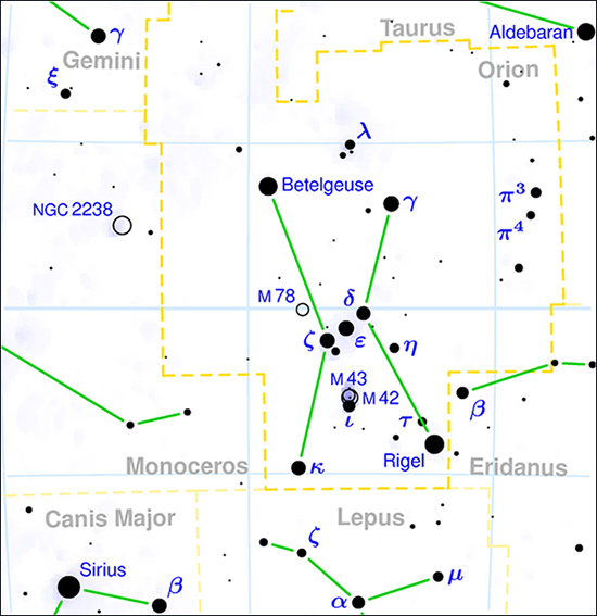 Orion is a prominent constellation located on the celestial equator and visible throughout the world. It is one of the most conspicuous and recognizable constellations in the night sky. It was named after Orion, a hunter in Greek mythology. Its brightest stars are Rigel (Beta Orionis) and Betelgeuse (Alpha Orionis), a blue-white and a red supergiant, respectively.