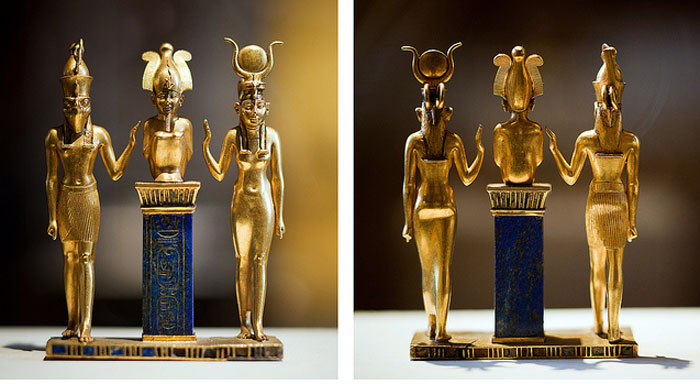 flanked by Horus on the left and Isis on the right (Louvre, Paris)