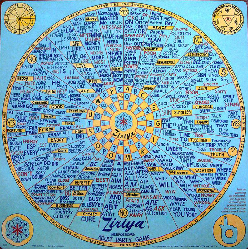 Place your planchette on the board. "Warm it up' by making several slow sweeping circles over the board. You can place positive energy - white light - over the board as you initiate it. You are now ready to begin. Good luck!