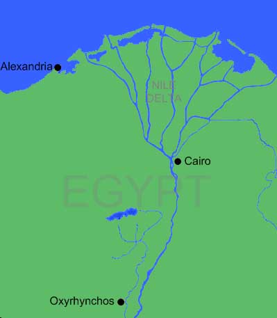 Oxyrhynchus is about 160 km south-southwest of Cairo, and lies west of the main course of the Nile, on the Bahr Yussef (Canal of Joseph), a branch of the Nile that terminates in Lake Moeris and the Fayum oasis. In ancient Egyptian times, there was a town on the site called Per-Medjed, but it did not become an important area until after the conquest of Egypt by Alexander the Great in 332 BC. It was then reestablished as a Greek town, called Oxyrhynchon Polis ("town of the sharp-nosed fish").
