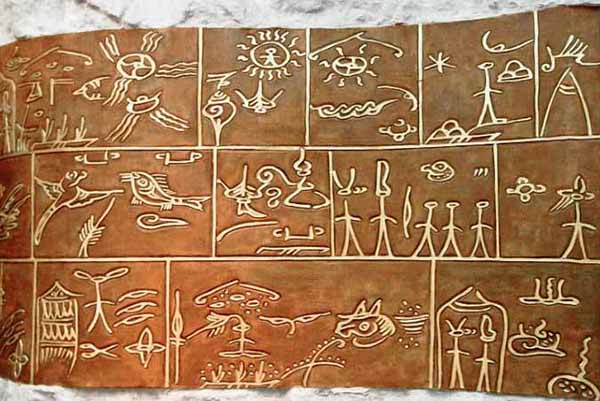 The Dongba symbols are an ancient system of pictographic glyphs created by the founder of the Bon religious tradition of Tibet and used by the Naxi people in southern China. Historical records show that this unique script was used as early as the 7th century, during the early Tang Dynasty, however, research conducted last year showed that its origins may date back as far as 7,000 years ago. Incredibly, the Dongba symbols continue to be used by the elders of the Naxi people, making it the only hieroglyphic language still used in the world today. The Naxi people lived in the beautiful mountain province of Yunnan (Òsouth of the cloudsÓ) for thousands of years, where they developed their own rich and enduring culture. Today, most of the 270,000 Naxi people live in the county of Lijiang where they retain many of their ancient traditions.