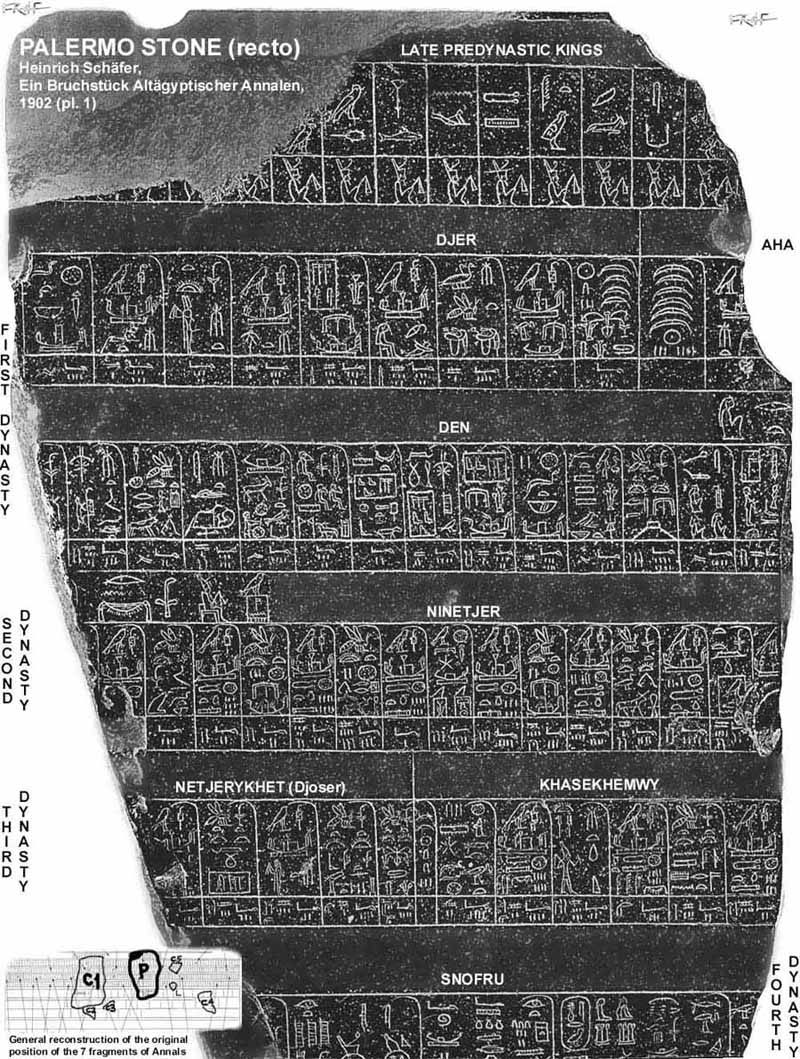It is a hieroglyphic list of the kings of ancient Egypt before and after Menes, with regnal years and notations of events. It also includes such information as the height of the flooding of the Nile in various years, information on cult ceremonies, taxation, sculpture, buildings and warfare.
