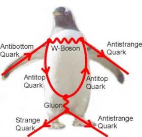 Penguins are popular in the grid and will remain that way. Here's another twist on their relevance ... "This Penguin Diagram shows the top quark inside the loop forming the belly of the penguin, or the quantum effect. The New Physics being probed would be the presence and participation of other, new particles in this loop."