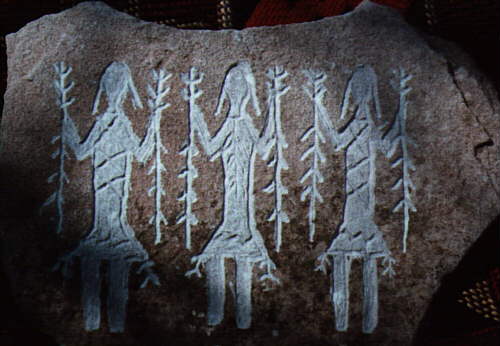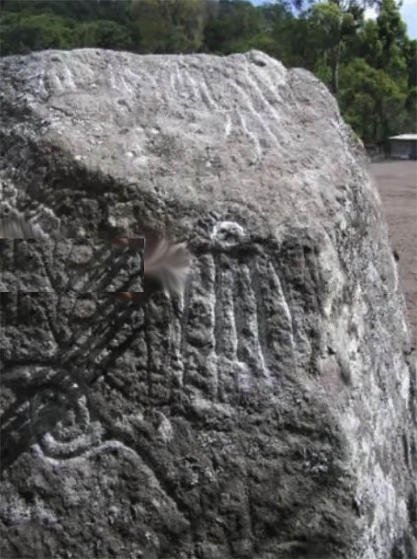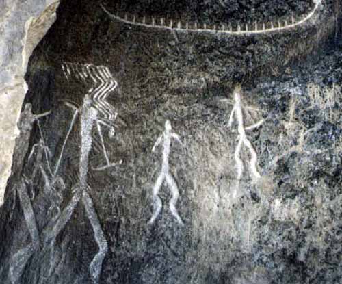 The waging of war between the Star Beings is recorded in the petroglyph to the right. The Star Beings and their counterparts, the two horned priests, are wreaking havoc upon the inhabitants of the Ancient City (represented by the smaller beings who are fleeing.)