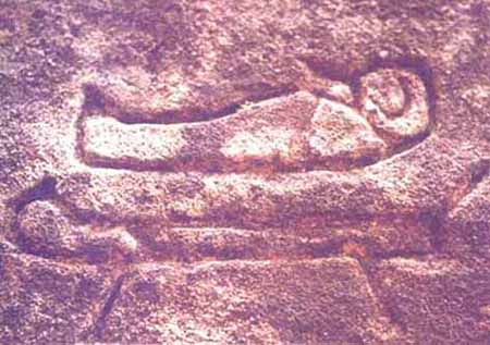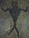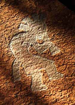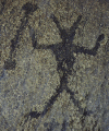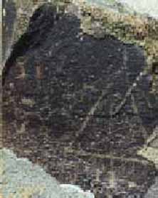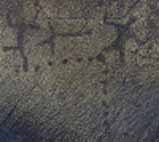 This petroglyph is located on a rock adjacent to the rock shown above. It depicts the two horned Priest. It should be noted that the dumbbell shaped apparatus held in his hand may represent an archtimeter. Reference to this can be found in Alice Bailey's writings, as well as in the hieroglyphs of Egypt. These tools are said to have wielded the power of life and death.