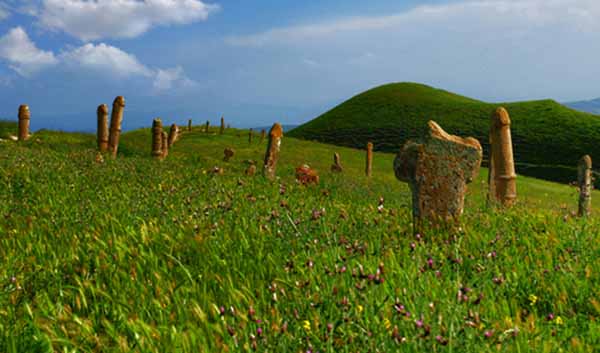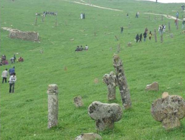 There are no engravings marking the dates of these phallic tomb stones but historians believe it to be of (Turkoman) tribal heritage who speak a dialect of Persian reside in northeast Iran and lead a nomadic life and training horses). They live a mostly nomadic life, making a living from training horses. as recent as the 17th or 18th century. However, the mausoleum or tomb on the Gokjeh Mountain is believed to be that of Khaled Nabi. The cemetery according to legend contains stones of people who were cursed by god for their sins and belonged to people who believed in fetishism centuries ago. The tomb is a religious pilgrimage place where women pray seeking boons for their welfare, by way of tying ribbons in close by trees. The isolated cemetery has become popular tourist attraction in Iran and a source of amusement amongst visitors.