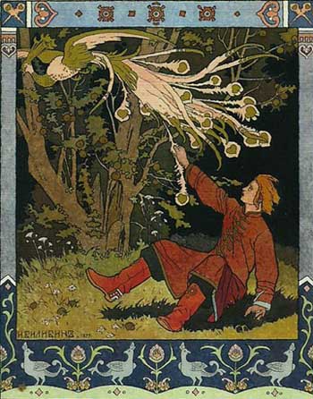 The Firebird tales follow the classical scheme of fairy tale, with the feather serving as a premonition of a hard journey, with magical helpers met on the way who help in travel and capture of the Bird, and returning from the faraway land with the prize. The most popular version is found in the tale of Ivan Tsarevich and the Grey Wolf.