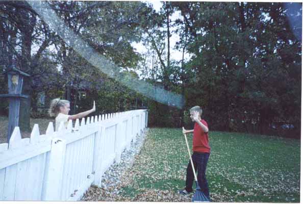Lindsay is the only photographer in our house who can capture interesting images in her pictures. She was taking this one of her brother, Mark waving to his friend Samantha. I find it interesting the image is directed from or towards Mark's head.