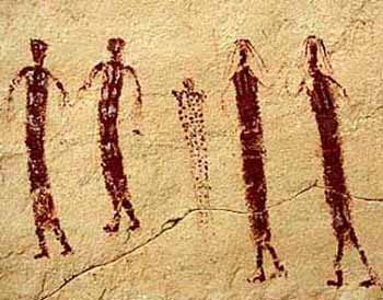 Some of the painting have bizarre depictions of what appear to be spacemen wearing suits, visors, and helmets. resembling modern day astronauts. This takes us to the west African tribe - the Dogon whose legends say they were guided to the area from another part of Africa that was drying up - by fish gods called the Nommo who came in huge ships from the sky.