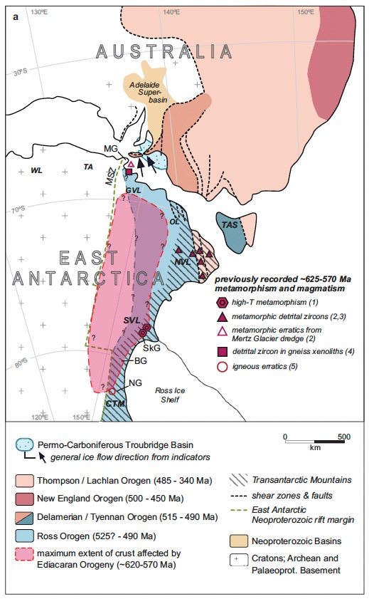 Joining the dots with ice-flow indicators in the South Australian glacial sedimentary rocks that garnet-rich glacial sands were ground out of the Antarctic mountains - which are yet to see the light of day - by an ice sheet moving north-west during the Late Palaeozoic Ice Age, when Australia and Antarctica were connected in supercontinent Gondwana.
