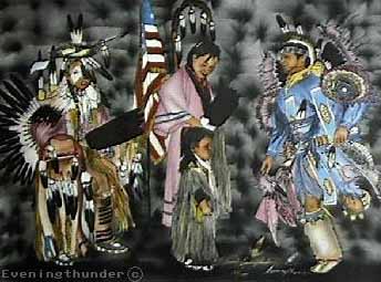 After all the dancers are in the arbor, a flag song is sung, then a victory song. The flag bearers then proceed with the flags to the front of the arbor. After Grand Entry an opening prayer will be offered in a native language or in English. This is done out of respect for the flags and our traditional ways. It is very important for spectators to rise and remove their hats during the prayer. After the prayer, the opening song starts the Pow Wow. Now the time to enjoy the Pow Wow has arrived.