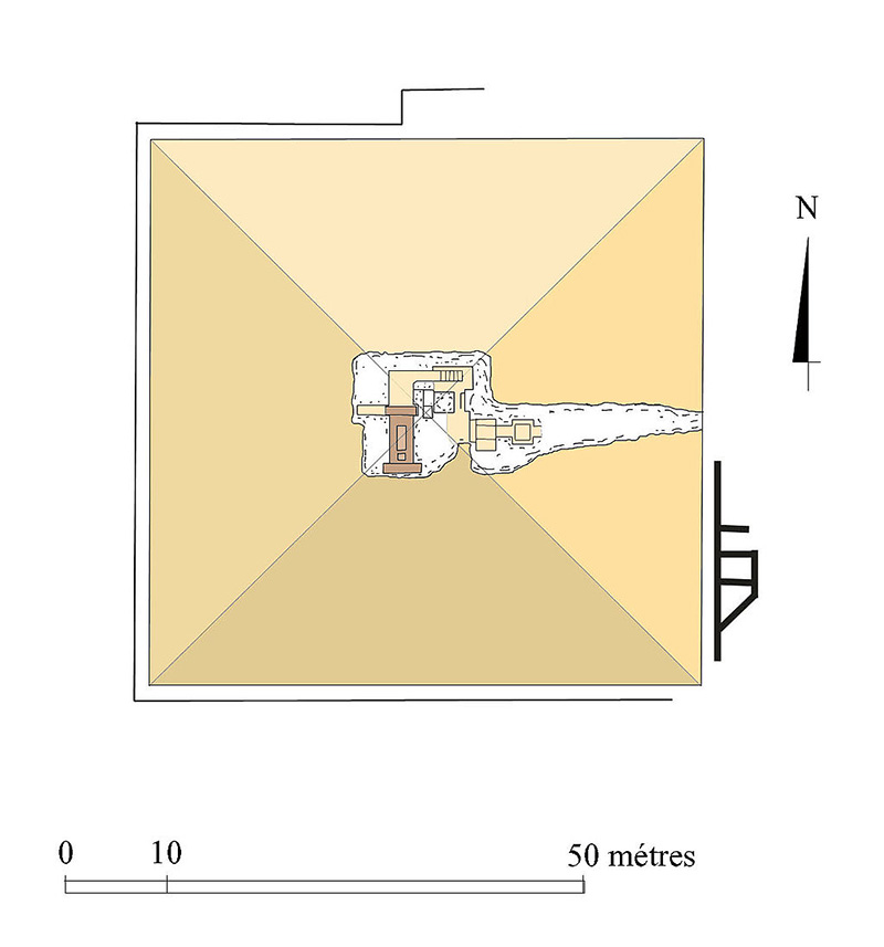 This pyramid was originally about 50 meters tall (164 ft). While the superstructure is almost completely destroyed, the substructure is better known. The entrance to the structure was in front of the east side, slightly north of its axis. This entrance leads to a corridor that first apparently led through several small chambers and a barrier before reaching a larger chamber with a stairway leading off to the right (north). This short passage lead to another stairway that again angled back towards the west before making a final left 90 degree turn towards the south and the burial chamber.