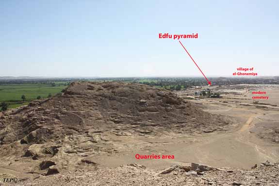 According to the archaeologists, the Edfu pyramid had been built directly on the sandstone bedrock and was made exclusively of sandstone and some calcareous sandstone blocks. The quarry area has been discovered only 800 m north of the site during an extensive preliminary survey conducted on some of the small hills that mark the desert edge at the site.