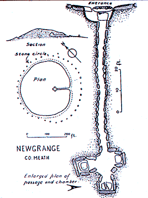 Newgrange was excavated and much restored between 1962 and 1975, under the supervision of Prof Michael J O'Kelly, Dept. of Archaeology, University College, Cork. It consists of a vast man-made stone and turf mound retained within a circle 97 large kerbstones topped by a high inward-leaning wall of white quartz and granite.