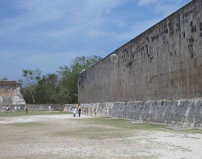 Archaeologists have identified several courts for playing the Mesoamerican ballgame in Chichen, but the Great Ball Court about 150 metres (490 ft) to the north-west of the Castillo is by far the most impressive. It is the largest ball court in ancient Mesoamerica. It measures 166 by 68 metres (540 ft x 220 ft). The imposing walls are 12 metres (39 ft) high, and in the center, high up on each of the long walls, are rings carved with intertwining serpents.