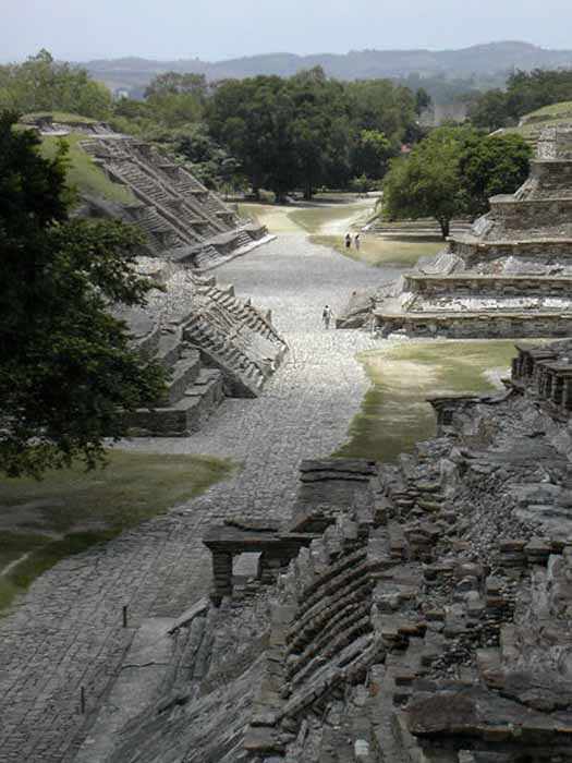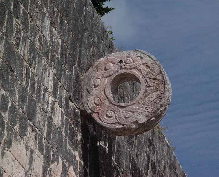 At the base of the high interior walls are slanted benches with sculpted panels of teams of ball players. In one panel, one of the players has been decapitated and from the wound emits seven streams of blood; six become wriggling serpents and the center becomes a winding plant.