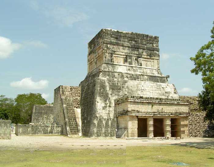 In the entrance to the Lower Temple of the Jaguar, which opens behind the ball court, is another Jaguar throne, similar to the one in the inner temple of El Castillo, except that it is well worn and missing paint or other decoration. The outer columns and the walls inside the temple are covered with elaborate bas-relief carvings.