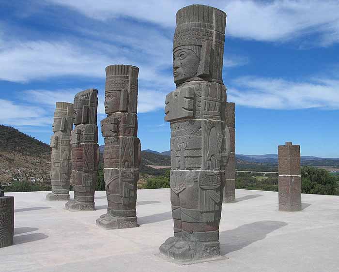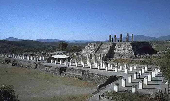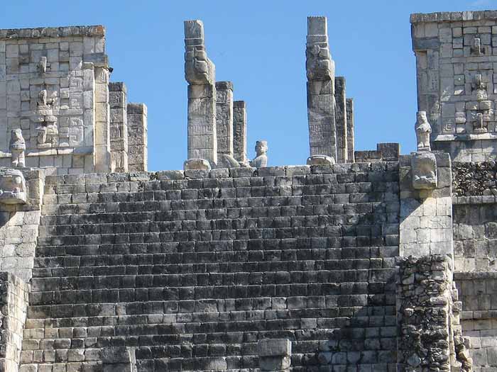 The Temple of the Warriors complex consists of a large stepped pyramid fronted and flanked by rows of carved columns depicting warriors. This complex is analogous to Temple B at the Toltec capital of Tula, and indicates some form of cultural contact between the two regions. The one at Chichen Itza, however, was constructed on a larger scale.