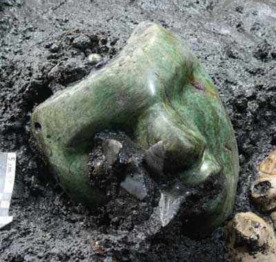 Archaeologists in Mexico have uncovered a small treasure trove of items that may have been placed as offerings to mark the start of construction on the Teotihuacan Pyramid of the Sun almost 2,000 years ago. The offerings include pieces of obsidian and pottery as well as animal remains. Perhaps most striking are three human figurines made out of a green stone, one of which is a serpentine mask that researchers think may have been a portrait.