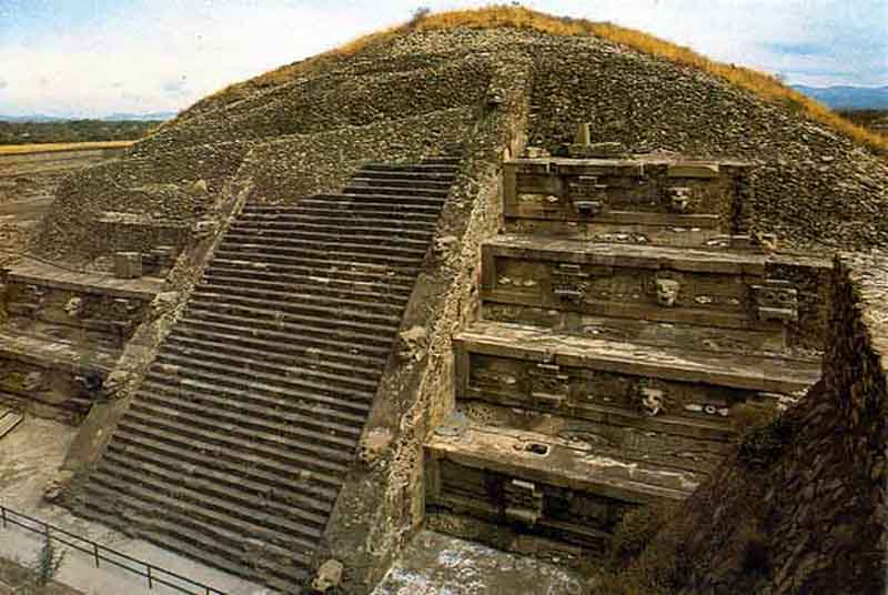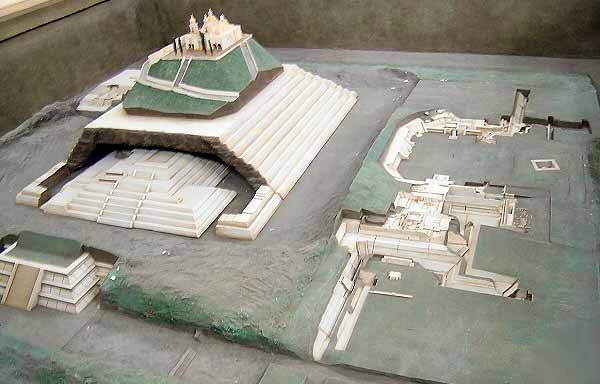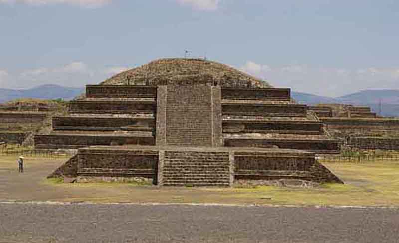 Between 100 and 500 A.D, an ancient people built a flourishing metropolis called Teotihuacan on a plateau about 25 miles (40 km) from present-day Mexico City. With its accurately aligned avenues and a huge plaza surrounded by 15 monumental pyramids. It was said by the Aztecs to have been surmounted by a huge stone figure related to the moon but this figure was uncovered (weighing 22 tonnes and was somehow lifted to the top of the pyramid) and it is thought more likely that it represents a water deity.