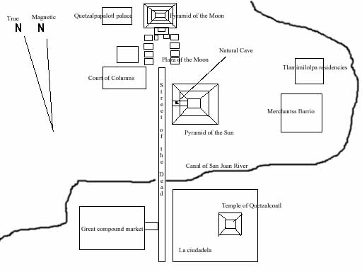 Opposite Chalchiuhtlicue's altar is the Plaza of the Moon. The Plaza contains a central altar and an original construction with internal divisions, consisting of four rectangular and diagonal bodies that formed what is known as the "Teotihuacan Cross."