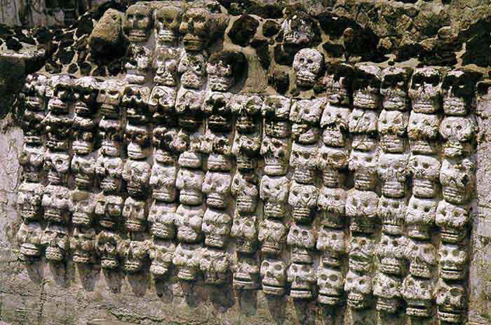 The Temple of the Jaguar features a jaguar throne with red paint and jade spots. Behind this platform is a walled inscription which depicts a relief of Tzompantli - a low, flat platform surrounded with carved depictions of human skulls. A doorway at the base of the north stairway leads to a tunnel, from which one can climb the steps of the earlier version of El Castillo inside the current one, up to the room on the top where you can see King Kukulcan's Jaguar Throne, carved of stone and painted red with spots made of inlaid jade.