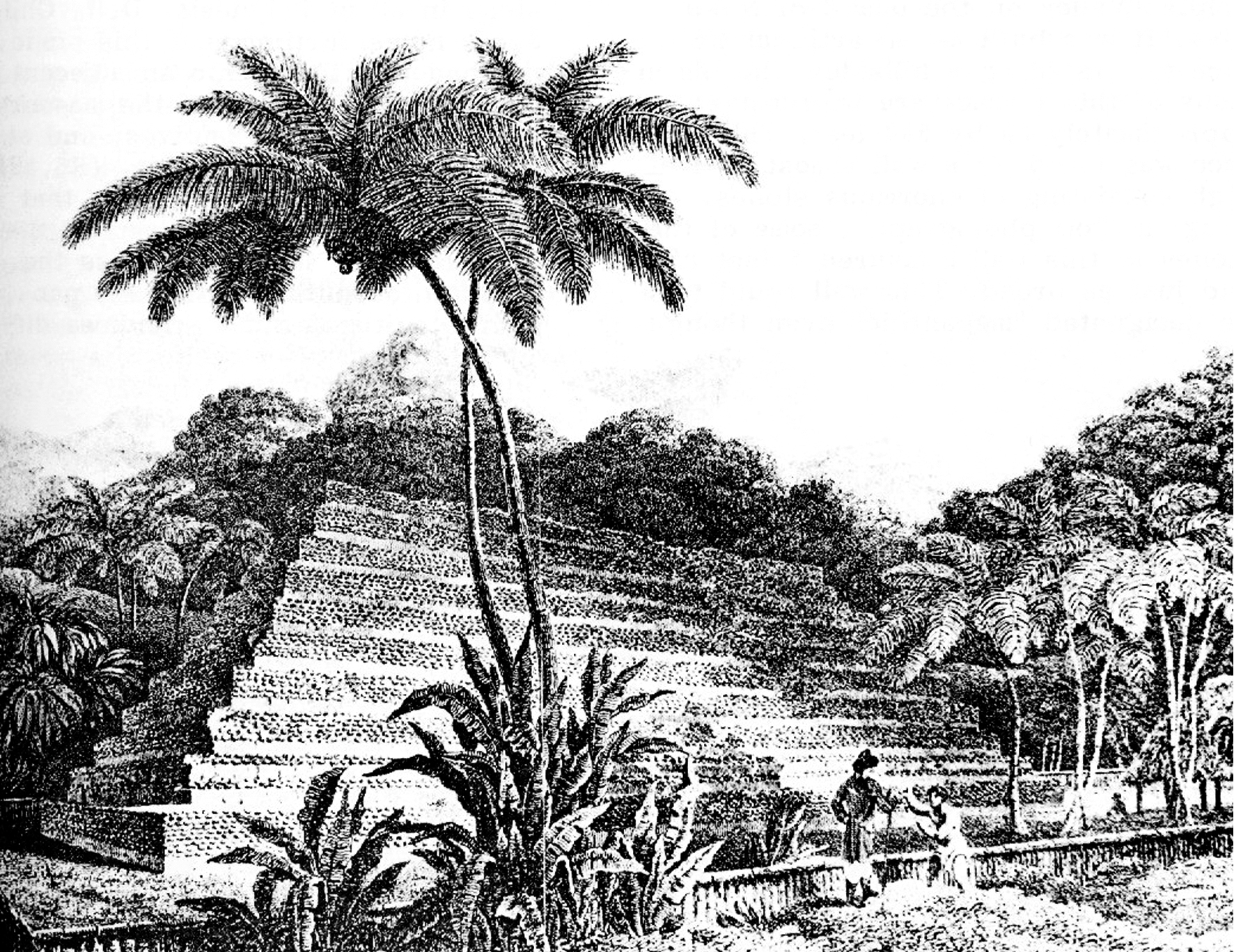 When Captain Cook visited Tahiti, he described the Marae of Mahaiatea as having a stepped pyramid with a base of 259 by 85 feet. Unfortunately all that remains today is a pile of stones. This drawing comes from the 1799 book The Voyage of McDuff.