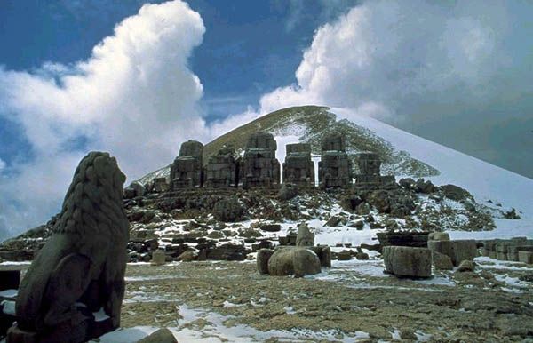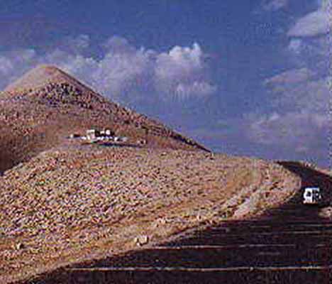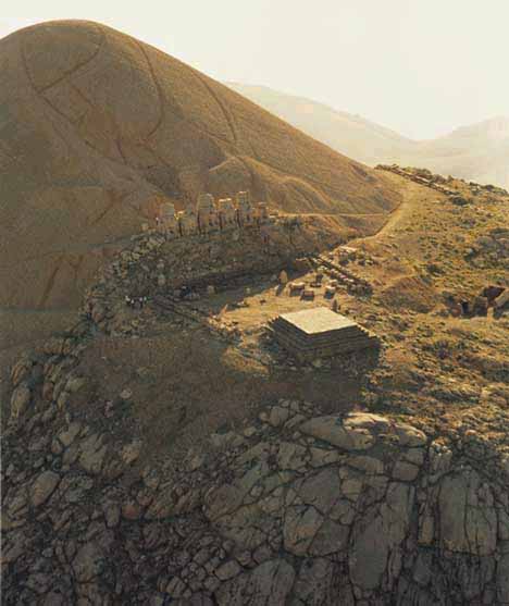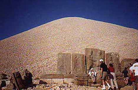 Mt Nemrut, Kahta is a natural mountain (2150m), with a 50 metre artificial peak built on top. It was constructed as a tomb for King Antinochus I during the period 80 B.C-72 B.C. If pyramids are meant to represent mountains, the builders of this one have gone a step further by placing it on top of a real mountain. Not just an artificial mound, this site features huge (10 metre high) statues.