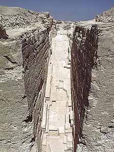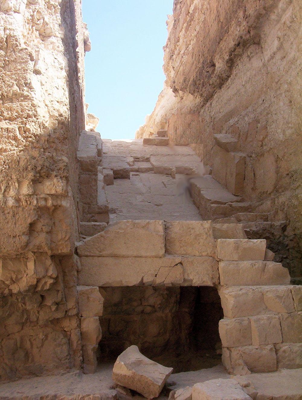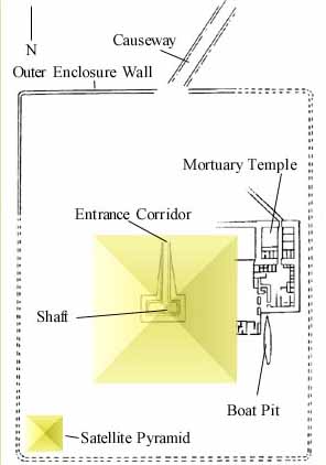 The problem is that until the end of the 3rd Dynasty, mortuary temples were erected on the north side of pyramids, but beginning with the 4th Dynasty onward, they were located at the foot of the east side of the pyramid. If indeed there was a mortuary temple on the north, unexplored area of the complex, then this would have been a reversion back to earlier layouts. However, it should also be noted that the corridors and burial chamber of the pyramid itself, below, rather than in the superstructure, was also a reversion, and while the roofs of this substructure is highly damaged, it appears that the design may be similar to the earlier style of Djoser's Step Pyramid at Saqqara.